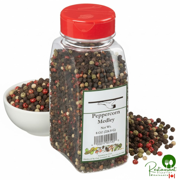 The Prime gourmet peppercorn medley features white, black, green, and pink peppercorns, all of which have unique flavors. Their colors look especially great when stored in clear acrylic peppermills, which can show off this blend's interesting appearance. Put out individual grinders or stock your back-of-house area to season your food while it's cooking. This medley even comes in a handy 8 oz. container that's perfect for use in a low- to medium-volume establishment.
