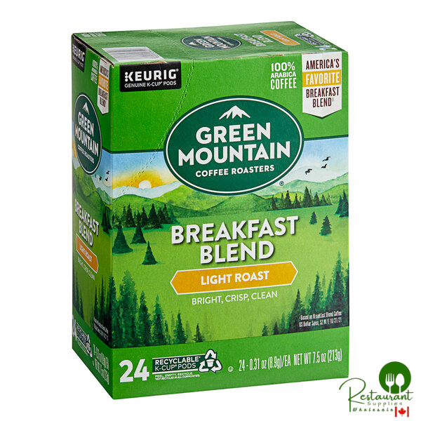 Help your customers start their day on the right foot with these Green Mountain Coffee Roasters breakfast blend single serve Keurig® K-Cup® pods! Made with sustainably sourced, 100% Arabica coffee beans, this blend is a customer favorite for a reason. This light roast coffee has a clean, bright flavor with a balanced sweetness, nutty notes, and a silky smooth mouthfeel. With a complex yet balanced taste, this coffee is perfect for serving black or offering with cream, sugar, or a splash of flavoring syrup. Just pop a pod in your Keurig® brewer and you'll be serving delicious coffee in minutes!