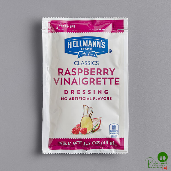 Known for providing unrivaled quality and superior flavor, offer these Hellman's 1.5 oz. raspberry vinaigrette dressing packets at your salad bar, restaurant, or catered event! This dressing boasts a juicy, sweet flavor profile with hints of raspberry and oregano for a complex taste your customers know and love.