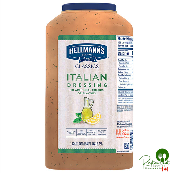 Offer a classic favorite that's made exceptionally well with this Hellmann's Italian dressing! This popular dressing will make a great addition to your establishment's kitchen and salad bar. Made with wholesome ingredients like real garlic, onion, peppers, and red wine vinegar, this Italian dressing offers the well-balanced, savory, acidic, complex flavor your customers crave. Plus, this delicious dressing is gluten-free and formulated without artificial flavors and colors, making it a product you can feel good about serving!