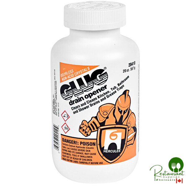 Keep your drains operating effectively with this Hercules by Oatey Glug 20410 20 oz. crystals drain opener. This drain opener uses crystals that are fast working and clear sluggish drains with ease. It is also efficient at preventing clogs by quickly dissolving hair, grease, soap, food, and most organic material.