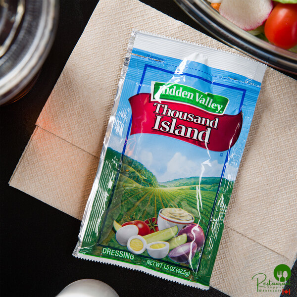 Stock up on these Hidden Valley 1.5 oz. thousand island dressing packets for your salad bar, restaurant, or catered event! The perfect blend of sweet and savory flavors, this dressing will deliver just the right amount of tangy taste to your customers' foods. With its mix of tomato, relish, oil, and spices, it adds a thick and creamy texture and zesty flavor to your sandwiches, subs, or salads. This classic dressing has a characteristic reddish-orange color.