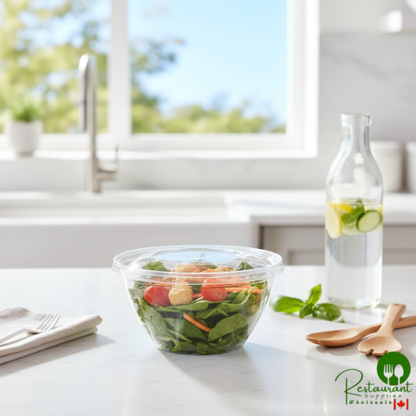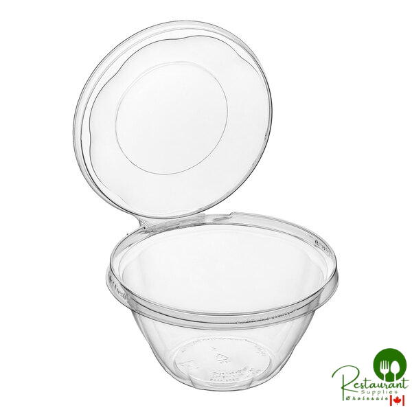 This container's single-piece, hinged dome lid design locks in freshness and keeps out unwanted contaminants. The container is stackable, allowing you to create visually appealing multi-level displays that will catch customer attention. Plus, the container's clear material and smooth walls deliver exceptional product clarity, while its rounded bottom makes it easy for customers to scoop up salads, sides, or restaurant leftovers.
