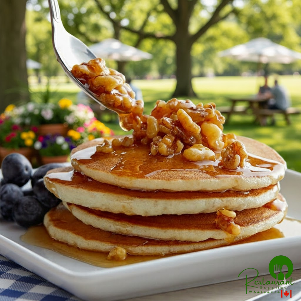 Premium dessert topping with real English walnut halves in maple-flavored syrup