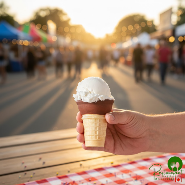 The rich milk chocolate dip along the rim adds a luxurious touch that transforms ordinary ice cream servings into premium desserts. The chocolate coating provides a delightful contrast to the crisp, fresh cone, creating an irresistible treat that encourages repeat purchases and increased order values.