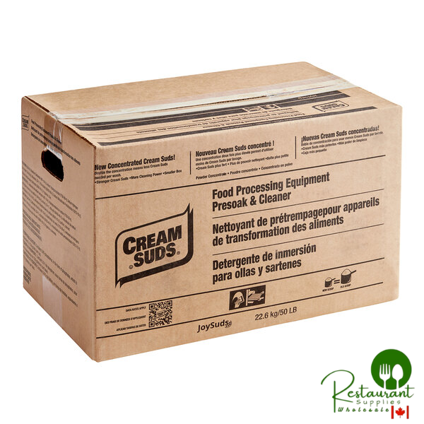Effortlessly cut through heavy grease and baked-on foods with JoySuds Cream Suds 43612 50 lb. food processing equipment, pot & pan presoak and detergent powder. This powerful formula will save you plenty of time and effort when cleaning. Simply add a cup of this concentrated powder to a sink full of hot water and soak your pots and pans for 10-20 minutes, and enjoy how easy it becomes to scrub even the toughest soils off of your pans.