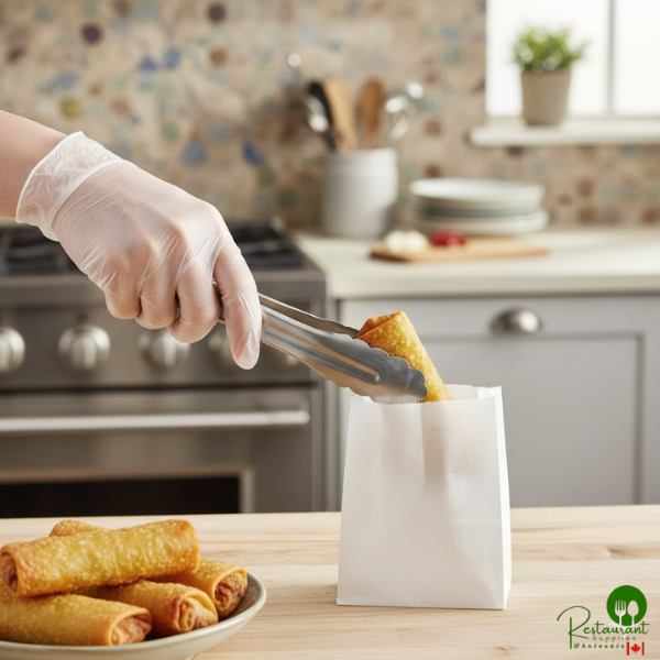 Designed with the on-the-go customer in mind, these carryout bags can withstand heated temperatures, making them suitable for both hot and cold food items. Whether you're packaging egg rolls, peanuts, baked goods, or snack foods, this durable glassine material provides the perfect combination of strength and functionality for your establishment's needs.