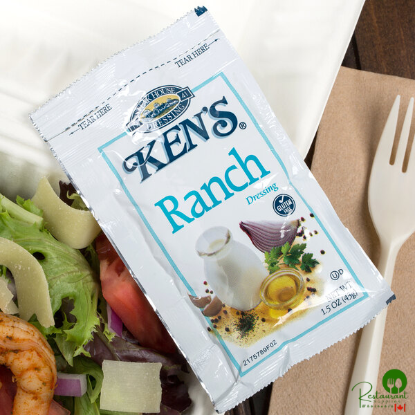 Stock up on Ken's Foods 1.5 oz. ranch dressing packets for your salad bar, restaurant, or catered event! With a taste that's cool and tangy, ranch dressing blends the familiar flavors of garlic, onion, and spices that customers know and love.