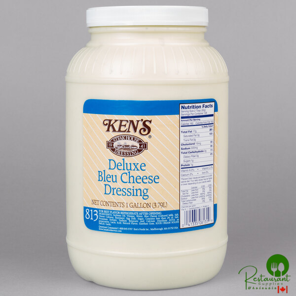 Stock up on this Ken's Foods 1 gallon deluxe bleu cheese dressing for your salad bar, restaurant, or catered event! This dressing blends chunky aged bleu cheese with spices and herbs for a superior taste. Your patrons won't want to miss adding its thick texture and full-bodied flavor to their foods.