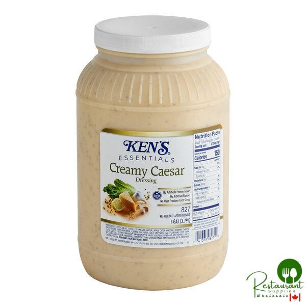 Stock up on this Ken's Foods Essentials 1 gallon creamy caesar dressing for your salad bar, restaurant, or catered event. Flavorful and slightly tangy with just the right amount of spices, it's thick and creamy enough to cling to romaine lettuce in salads or be spread on top of chicken caesar wraps.