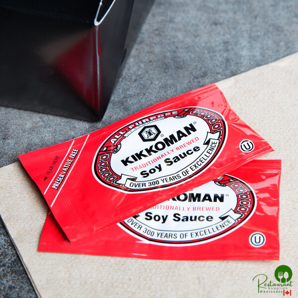 Kikkoman preservative-free soy sauce offers the same great flavor and appetizing aroma of regular Kikkoman soy sauce but with no added sodium benzoate or other preservatives! Packaged in convenient portion control aluminized packets, this soy sauce is great for customers on the go. Offer these packets in a caddy on your table or in your to-go bags, and your customers will have just the right amount of soy sauce to season their meals.