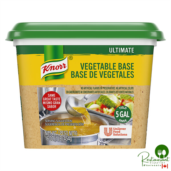 Whether making hearty soups or stews or discovering new ways to enrich and enhance the flavors of your dishes, this Knorr 1 lb. Ultimate vegetable bouillon base is sure to become a staple in your kitchen. Featuring high-quality broth made from a concentrated blend of onions, carrots, and celery, this vegetable base ensures an unbeatable, high-performing flavor that is extremely versatile in use.