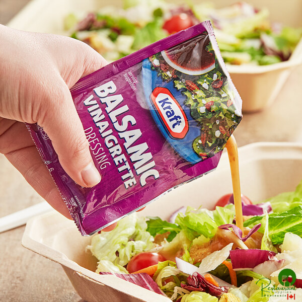 Add a tasty, flavorful kick to your dishes with these Kraft 1.5 oz. balsamic vinaigrette dressing packets! With a taste that's bright and refreshing, this balsamic dressing blends the delicious flavors of bold balsamic vinegar and spices into a sweet and tangy condiment.