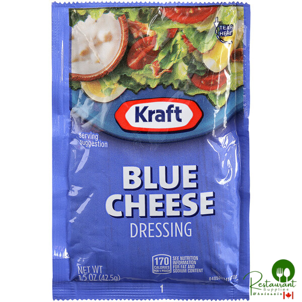Add a tasty, flavorful kick to your dishes with these Kraft 1.5 oz. blue cheese dressing packets! With a taste that's savory and tangy, this blue cheese dressing blends blue cheese pieces, egg yolks, vinegar, and spices into a thick, smooth dressing great for spreading, dipping, and clinging to lettuce. It's perfect for enhancing wraps, hot wings, salads, sandwiches, and veggies with its creamy texture and zesty flavor. This dressing provides customers with a flavorful accompaniment that they know and love.