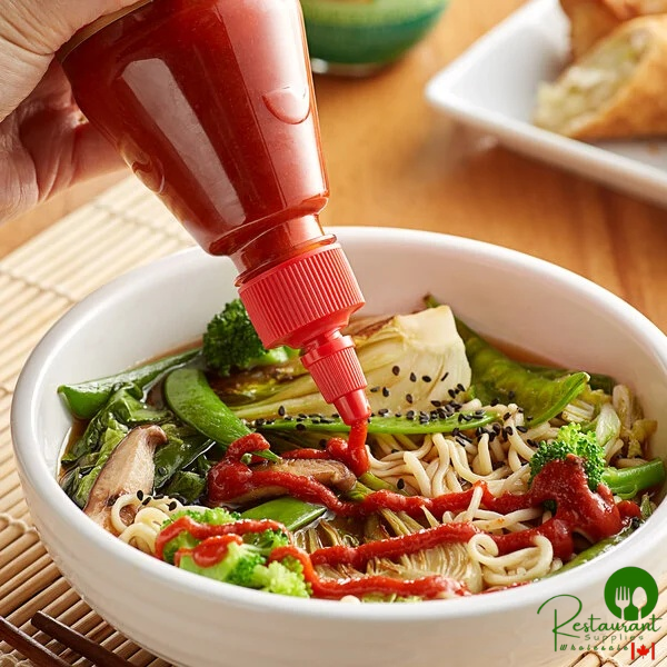 The sauce's thick consistency makes it perfect for drizzling over entrees, using as a spicy dip for meats and fried appetizers, or incorporating into stir frys, noodle dishes, and a whole host of other popular recipes. Packaged in a convenient 18 oz. squeeze bottle with a twist nozzle, this ready-to-use sriracha chili sauce is easy to reach for while you're preparing food or you can offer it as a condiment on tabletops so customers can season their food exactly to their liking!