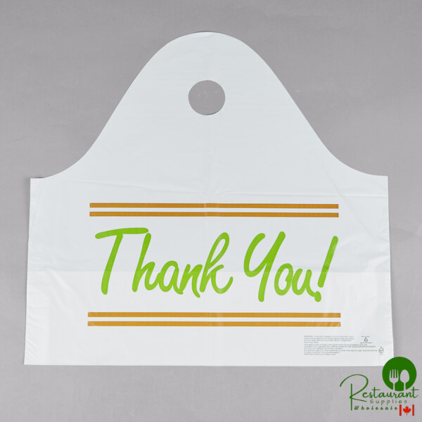 Use this LK Packaging 19" x 9 1/2" x 18" White Plastic Take Out Bag with Printed Thank You Design to make packaging to-go orders a breeze! It features a bell-shaped top and sturdy carrying handle for easy transportation. Plus, it's specially designed to sit open on a counter for simple product insertion.