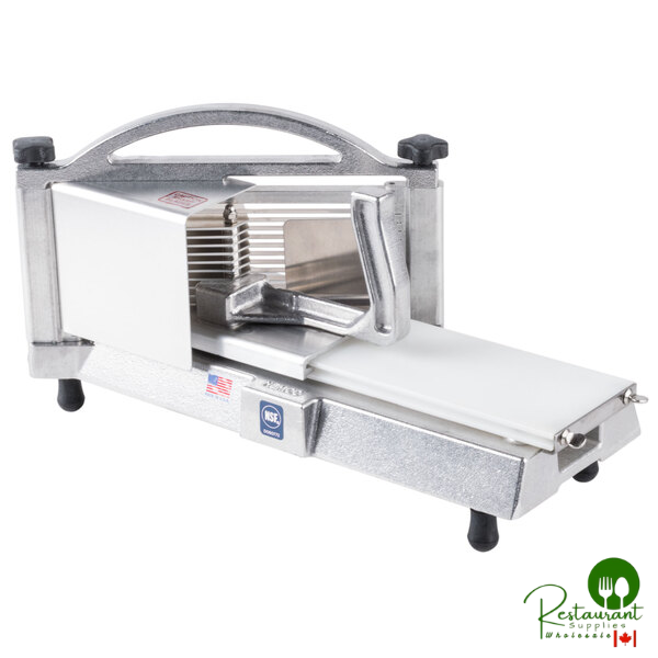 This specialized slicer eliminates time-consuming manual preparation, allowing kitchen staff to process large volumes of tomatoes quickly and consistently. Ideal for restaurants, delis, and foodservice operations that require uniform tomato slices for sandwiches, salads, and garnishes while maintaining high standards of food presentation and preparation efficiency.