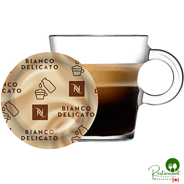 Delight your customers with coffeehouse-style drinks by using these Nespresso Professional Bianco Delicato single serve coffee capsules in your establishment! Carefully curated to deliver sweet, creamy flavor, this coffee blend contains premium arabica beans from Kenya and Indonesia that are split roasted to create one of the lightest roast coffees in the Professional line.