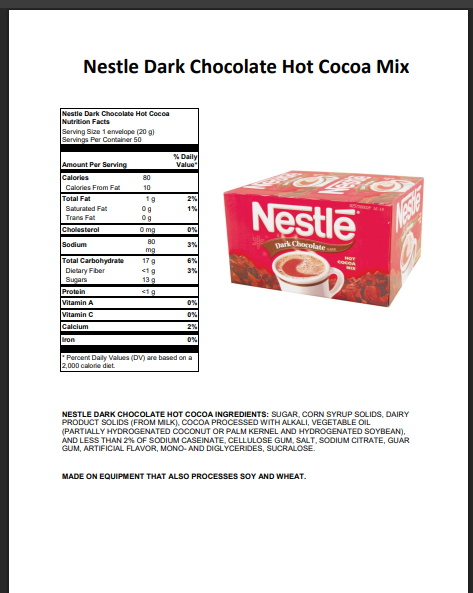 Allow your patrons to indulge in the little things in life with Restaurant Supply Wholesale Canada dark chocolate hot cocoa mix. For over 100 years, Restaurant Supply Wholesale Canada has been providing customers with the richest and creamiest chocolate products. With this dark cocoa mix, you can remind your guests of warm memories spent enjoying a cup of hot cocoa with loved ones on a cold winter's day - and now they can have those moments any time of the day or year. Made of only the best ingredients, the dark hot cocoa mix is sure to satisfy chocolate-lovers of all ages. Packaged in individual serving-sized envelopes, this mix is also great for portion control. These convenient packets are ideal for use in your coffee shop, concession stand, office, waiting room, or as a hotel room amenity.