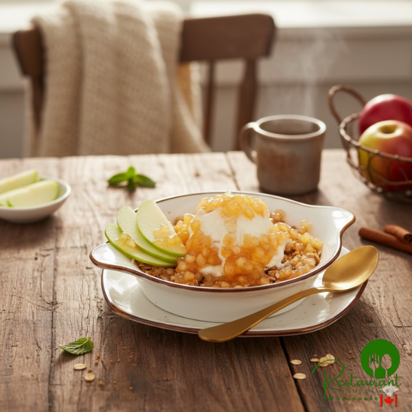 Instructions: Warm the apple topping and add a layer to the bottom of your parfait glass. Add ice cream and another layer of apple topping, then top it all off with a layer of butterscotch topping and a dollop of whipped cream!