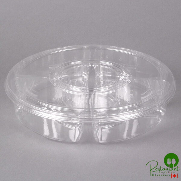 This high-capacity 5-compartment round platter is perfect for displaying fresh fruits, vegetables, cheeses, deli meats, nuts, and candies. The clear PET plastic construction showcases your offerings while keeping foods separated to prevent cross-contamination. Features a convenient 16 oz. center compartment with indented thumb holes for easy sauce cup placement.