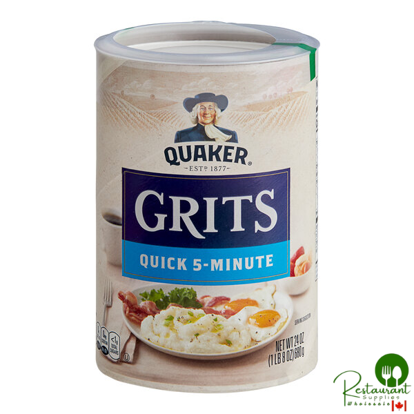 A southern staple, these Quaker 1.5 lb. quick 5-minute grits are great on their own or as part of a hearty, healthy breakfast, lunch, or dinner! Made from corn ground down into a coarse meal, these white hominy grits are a good source of calcium and iron.