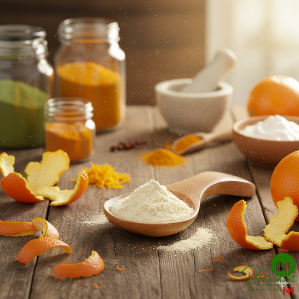 The peel of citrus has one of the highest concentrations of pectin, giving this powder an even higher level of soluble fiber than orange has when eaten fresh. It also is high in other vitamins and minerals including vitamin A, folate, riboflavin, thiamine, vitamin B6, and calcium. The powder has a fresh, zesty, slightly bitter flavor that complements a wide variety of recipes.