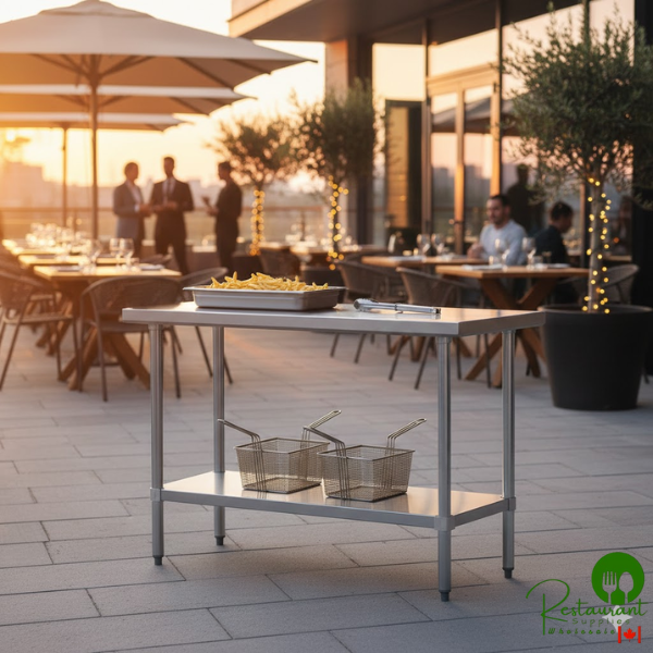 Ideal for food preparation, assembly work, and general kitchen tasks. The sturdy construction accommodates mixers, slicers, and other equipment. The undershelf organizes pans, bowls, and supplies. Suitable for restaurants, catering facilities, institutional kitchens, and food processing areas where hygiene and durability are essential.