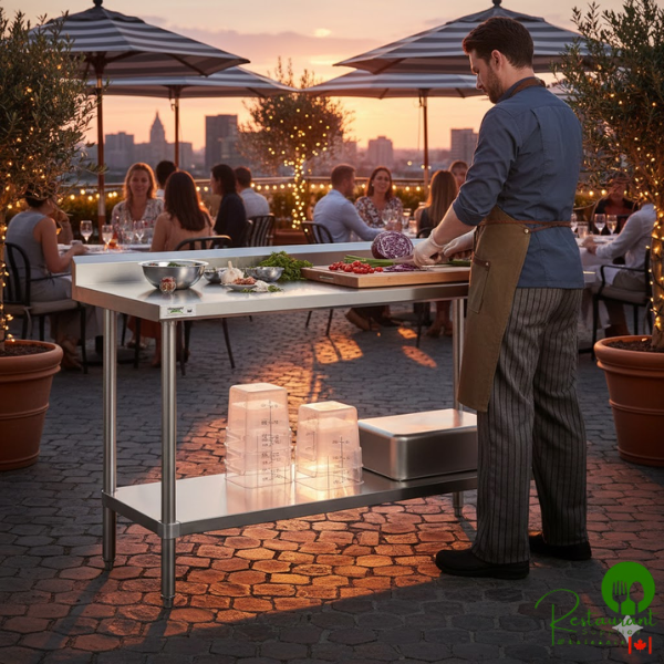 This work table is designed for various commercial environments including restaurant kitchens, catering facilities, bakeries, delis, food preparation areas, and institutional kitchens. The stainless steel construction ensures easy cleaning and maintenance while providing a hygienic surface for food-related tasks.