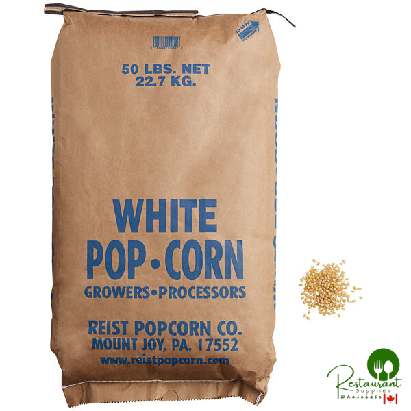 White popcorn offers a slightly sweeter, more delicate flavor compared to yellow varieties. The butterfly-style popcorn provides excellent surface area for toppings and seasonings to adhere, ensuring every bite is full of flavor. This 50 lb. bulk bag ensures you have ample supply for high-volume operations.
