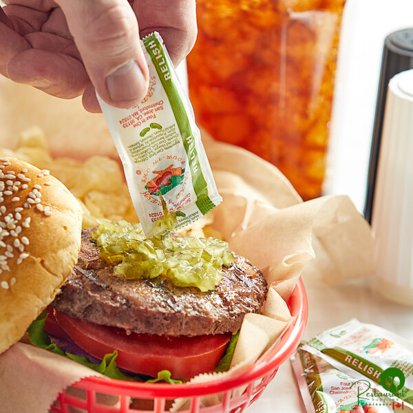 Sweet and salty, this delectable sweet relish will deliver just the right amount of tangy flavor to your customers' food. Each portion control sweet relish packet is filled with wholesome ingredients and bold spices. Perfect for any deli, concession stand, or diner, offer these packets in a caddy on your table or in your to-go bags, and your customers will have just the right amount of sweet relish for their meals.