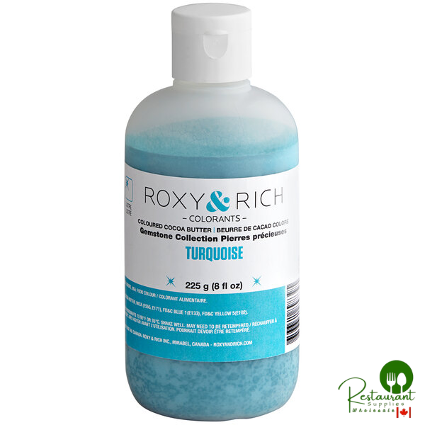 Create stunning turquoise confections with Roxy & Rich Cocoa Butter. This oil-soluble liquid features a shimmering blue-green color reminiscent of turquoise gemstones, perfect for elegant chocolate and pastry designs.