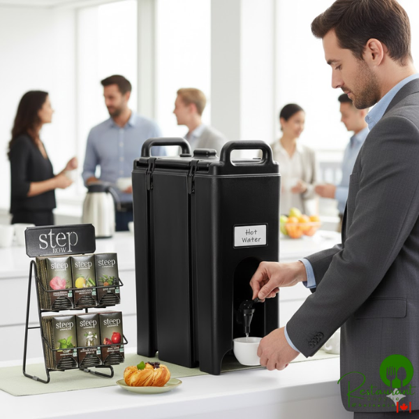 This Cambro 500LCD110 Camtainer® 4.75 gallon insulated beverage dispenser features a sleek black color and intuitive design. It offers everyday transport and storage of your most popular hot or cold beverages while providing an incredibly durable construction. A drip-proof recessed spigot allows for convenient access, and included self-adhesive beverage labels ensure quick identification of contents.