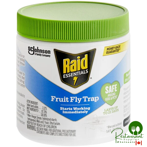 Maintain a bug-free environment with the SC Johnson Raid® Essentials fruit fly trap. This effective solution eliminates fruit flies instantly upon opening, creating a sanitary space ideal for restaurants, daycares, schools, grocery stores, and office buildings. Free from dyes, parabens, phthalates, sulfates, and artificial fragrances, it's safe for kitchen use and around children and pets while preserving your establishment's natural atmosphere.