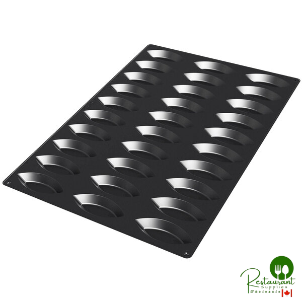 Create elegant boat-shaped desserts in high volume with this professional 30-compartment silicone baking mold. Designed for producing uniform oval "boat" confections, this black silicone mold is perfect for commercial bakeries, pastry shops, and confectioneries requiring bulk production of delicate, shaped desserts.