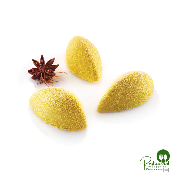 This Silikomart SQ071 silicone mold features 48 elegant quenelle-shaped cavities designed for professional dessert presentations. Crafted from 100% platinum liquid silicone, it offers superior food safety with non-toxic, odorless, and tasteless properties meeting FDA standards.