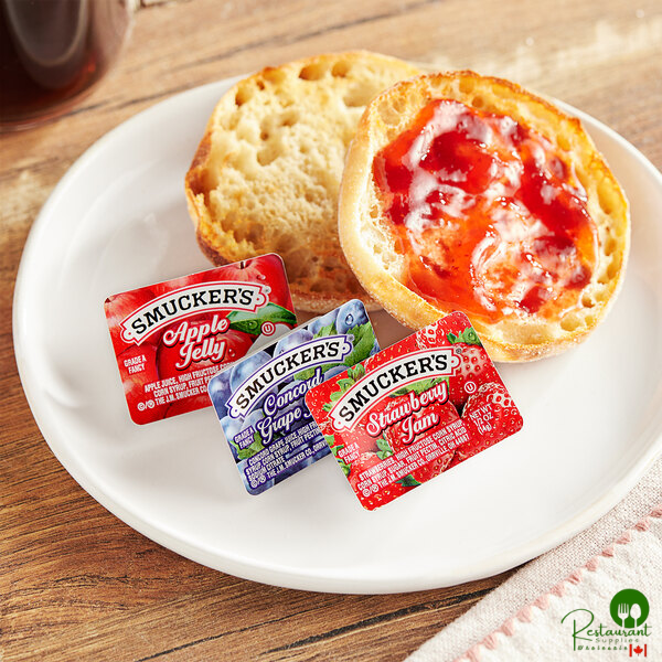 Packed with fresh flavor in each cup, you can't go wrong with this assortment of Smucker's 0.5 oz. concord grape jelly, apple jelly, and strawberry jam! The name Smucker's is highly recognized in just about any venue, and their premium selection of jams, jellies, and marmalades uphold a tradition of full-bodied flavor, great quality, and value.