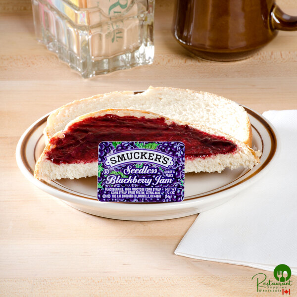 Just the right size for your patrons' dishes and packed with fresh flavor in each cup, you can't go wrong with Smucker's seedless blackberry jam! The name Smucker's is highly recognized in just about any venue, and their premium selection of jams, jellies, and marmalades uphold a tradition of full-bodied flavor, great quality, and value. Try these plastic portion cups in your restaurant, diner, school cafeteria, or convenience store. Their .5 oz. size is perfectly-portioned for a single serving, and your customers can even grab them on the go with their take-out meals.