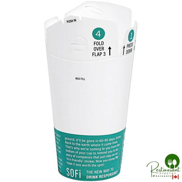 Step into the future with this innovative, eco-friendly SOFi all-in-one paper cold cup and lid 20 oz. Simply fold and connect four flaps to create a sealed cup without the hassle of a separate lid.