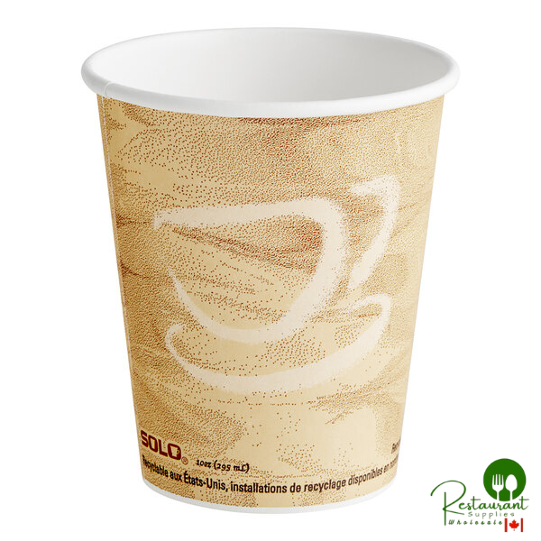 Send patrons on their way with this Solo 10 oz Mistique single-sided poly paper hot coffee cup. Featuring a visually-appealing coffee-inspired design, this cup is perfect for cafes, bistros, coffee shops, concession stands, or breakfast kiosks. Pair it with a compatible drinking lid (sold separately) to serve piping hot drinks to go.
