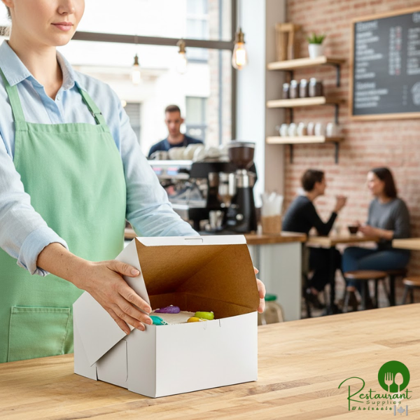The plain design allows for various customization options to advertise your business. This versatile cake and bakery box folds flat for space-saving storage and efficient transport, making it ideal whether you're selling sweet treats in your bakery or serving desserts at a catered event.