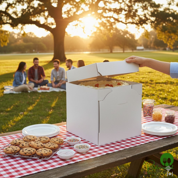 Locking corner tabs and side handles make assembly and transport effortless, with one side panel opening for easy cake placement.