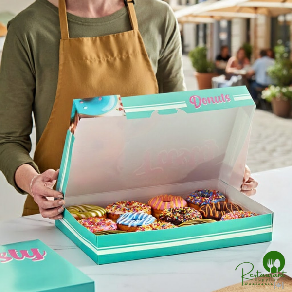 Crafted from sturdy 1-piece paperboard and preassembled with an innovative auto-popup feature that allows it to fully expand in seconds, saving you time and effort. Perfect for bakeries, cafes, and donut shops, this box is a convenient and ready-to-use option for keeping your flavorful pastries fresh.