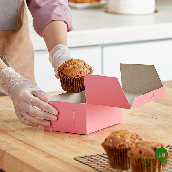 Note: This bakery box features a classic pink color that complements a wide variety of baked goods. The plain surface is perfect for customization with labels, stamps, or stickers to brand your bakery business.