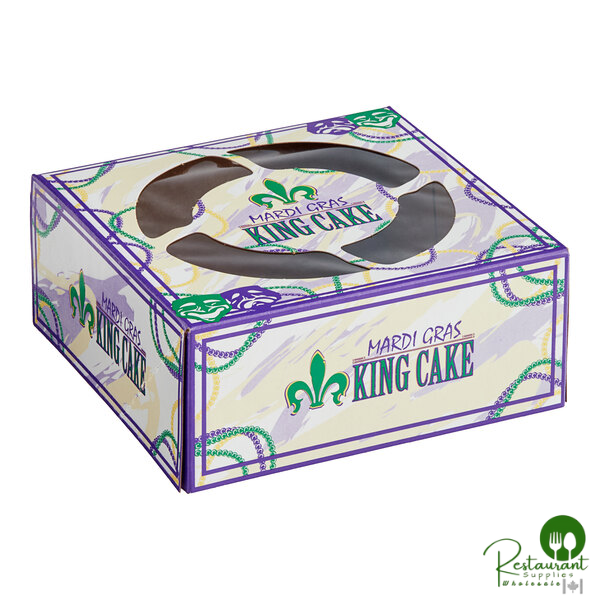 Celebrate king cake season with this Southern Champion 6" x 6" x 2 1/2" auto-popup window pie/bakery box featuring vibrant Mardi Gras king cake design! Made of durable one-piece paperboard, this bakery box showcases your beautifully prepared king cakes or other favorite seasonal treats.