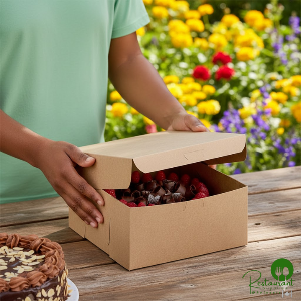Boxes ship flat for space optimization and assemble without tools or adhesives. Store unassembled boxes in dry conditions. The natural kraft appearance offers an organic, eco-friendly presentation that complements artisanal bakery products.
