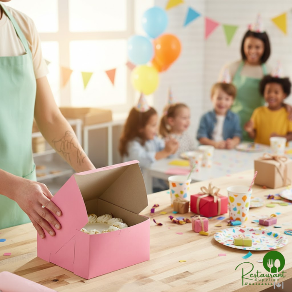 The plain pink design of this box offers excellent customization opportunities for your branding. This versatile cake/bakery box is perfect for cakes, cookies, and other bakery items. Whether you're selling sweet treats in your bakery or serving desserts at catered events, this box folds flat for space-saving storage and efficient transport.