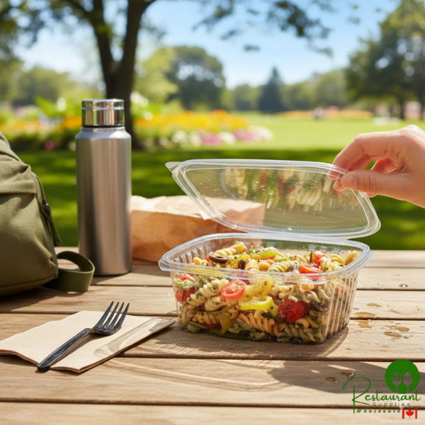 With the same strength as regular plastic, this PLA container requires 65% less energy to produce and emits 68% fewer greenhouse gases than plastic. Plus, it's resistant to leaking and has a clear design for optimal visibility of its contents!