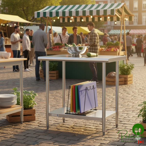 This table is made to perform the basic tasks of a work table like offering you a place to prepare fruits and vegetables, open cans, mix ingredients, and plate meals but without the initial cost of a heavier gauge table.