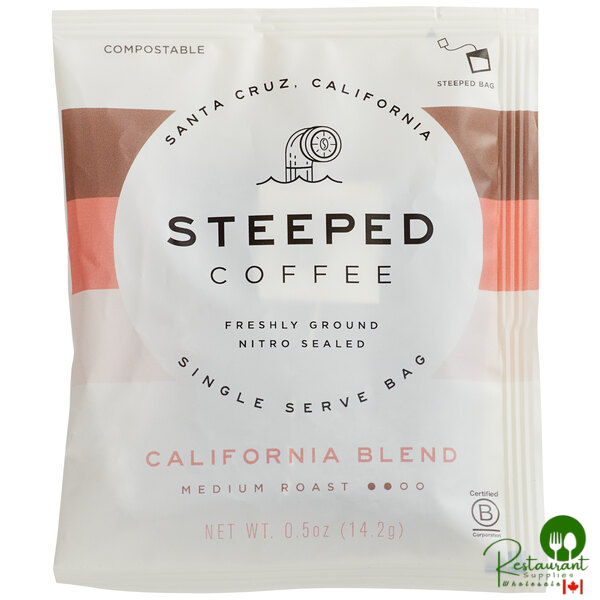 Offer high-quality, eco-friendly single serve coffee without the need for a coffee machine with this Steeped Coffee California blend coffee single serve bag! These innovative, commercially compostable single serve coffee sachets are filled with the perfect pre-measured amount of direct trade, specialty micro-roasted coffee.